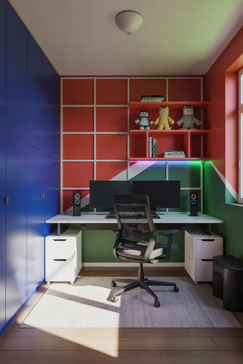 For the generation of kids who’ve grown up building worlds in Club Roblox and exploring user-generated universes, a bedroom inspired by that pixelated, blocky aesthetic has real sentimental weight. And the best versions of it are far more stylish than you’d expect. Use a bold primary color palette—cobalt,—cobalt, red, andred, and bright green—in—in geometric blocks of color on the walls (an actual painted grid or color-blocked sections), paired with a modern gaming setup, open shelving for plushies and figures, and LED lighting that can shift color with a controller. The room should feel like stepping inside a game—but—but one with good design principles.