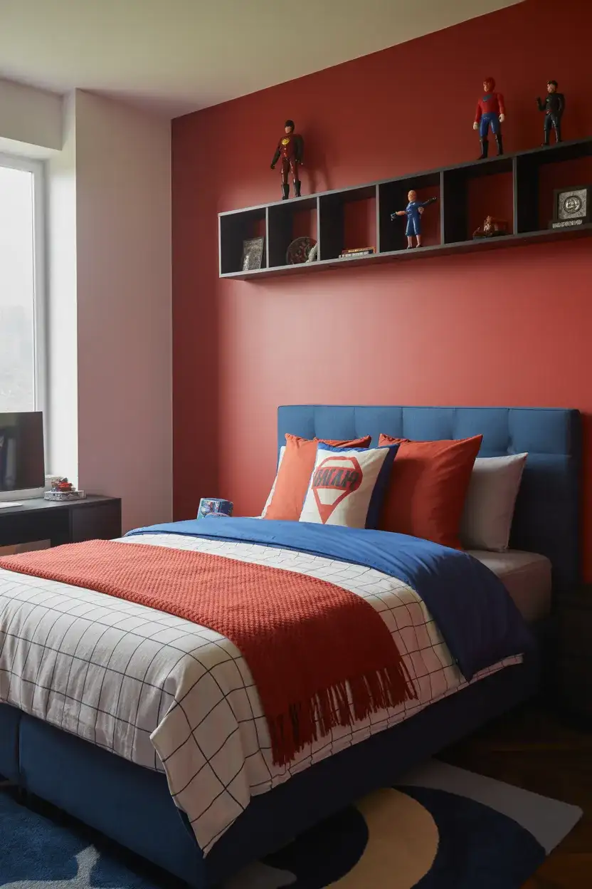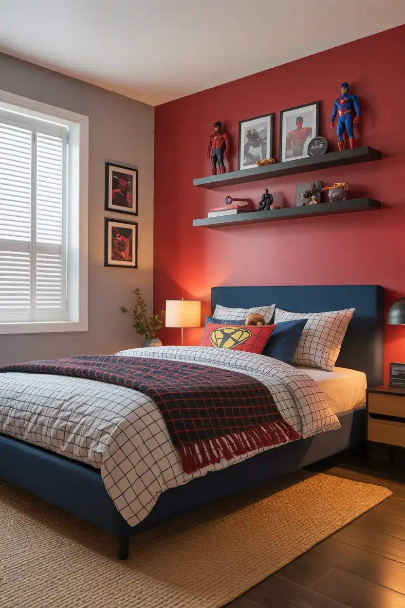 A Marvel bedroom can absolutely grow up with your kid—and—and the design world has caught on. The most sophisticated versions of this look pull the visual language of the comics (bold graphic shapes, primary colors with black accents, dynamic compositions) and translate them into actual room design decisions. A gallery wall of framed comic cover prints in matching black frames, a red or gold accent wall, and a neutral base in gray or white createcreate something that feels intentional and curated rather than assembled from a big-box store’s licensed section. This hits especially well in thethe 13-14 age ranges,ranges, where boys still love the franchise but want their room to feel mature.