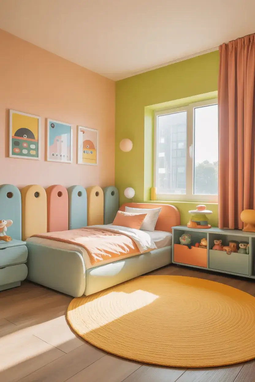 The Toca Boca visual world—those—those rich, flat, joyfully saturated colors and friendly rounded shapes—has—has inspired a genuinely charming bedroom aesthetic for younger boys who love the app world. Think candy-bright walls in peach, lavender, or lime green, paired with rounded furniture (a poufy chair, a circular rug, a bean bag in a pop color), open toy storage in matching hues, and illustrated or graphic prints that mirror the app’s visual style. This is pure joy as a design philosophy, and it works best for boys in that sweet spot of roughly 5 to 10 who are in peak Toca Boca mode.
