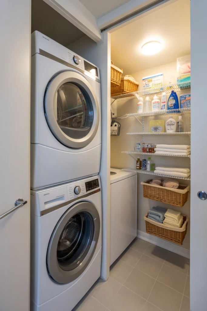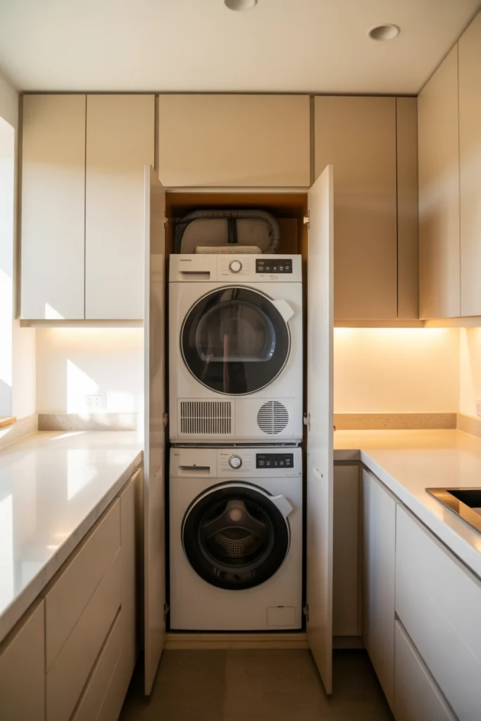 Hide your washer and dryer inside a built-in closet for a clean and seamless look. Add bi-fold or sliding doors that blend with the wall color. Include stackable storage inside, and if you use a stackable washer and dryer, leave enough space for ventilation. This trick is great for apartments or studios where visual calm and space saving are essential.
