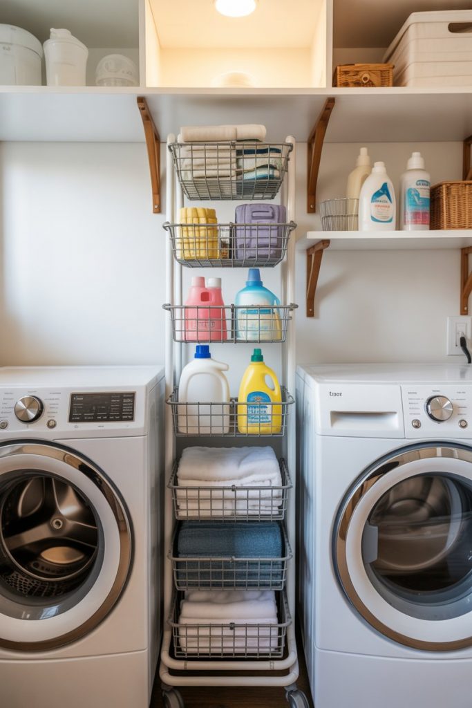 A narrow rolling cart is the ultimate space saving tool for laundry essentials. Slide it between machines or alongside a top loader to organize supplies. Choose a cart with small drawers or trays to hold detergents and cloths. Many home bloggers and stylists feature this idea for space saving small apartments in 2026 design guides.