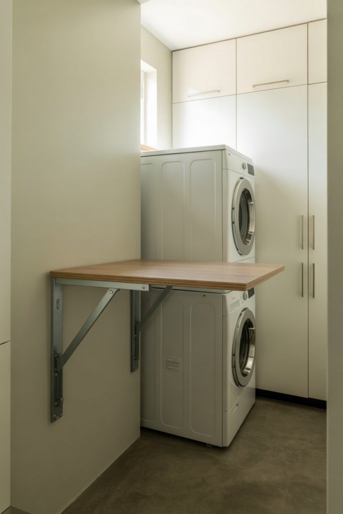 Install a fold-down table or mini countertop above your stackable unit to help with folding and sorting clothes. When not in use, it tucks neatly against the wall. Add a DIY folding station with a pegboard backdrop for hanging tools or baskets. This practical setup works perfectly in space saving small apartments or compact condos.