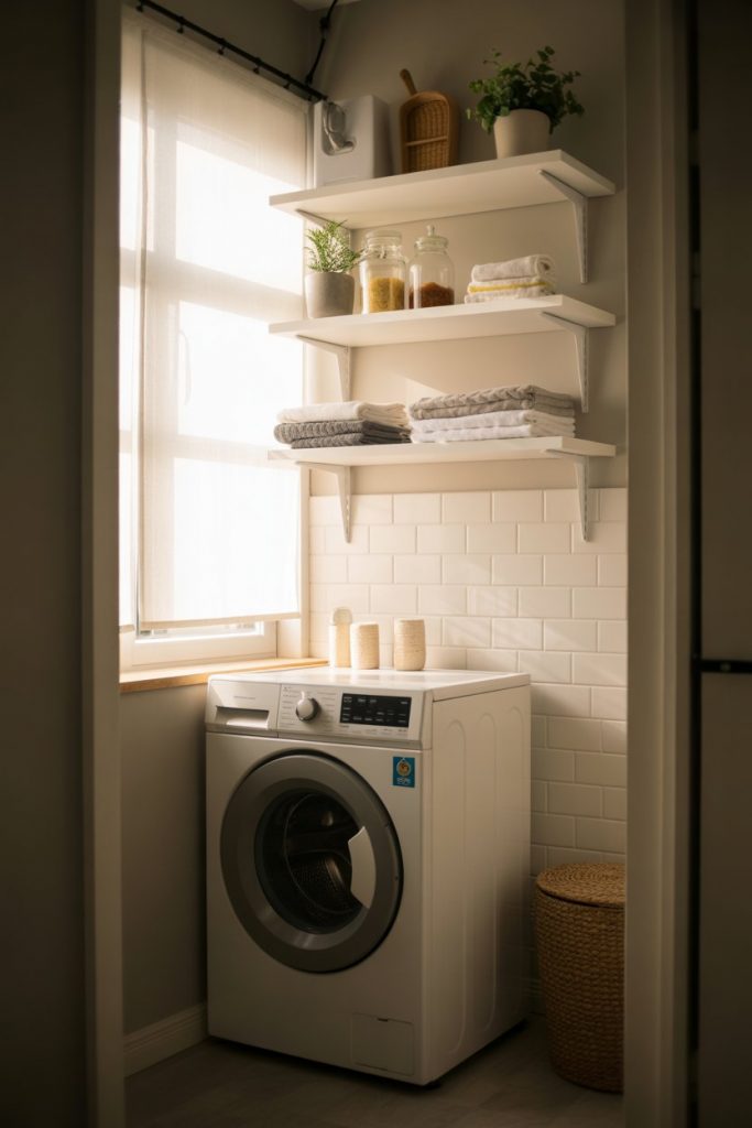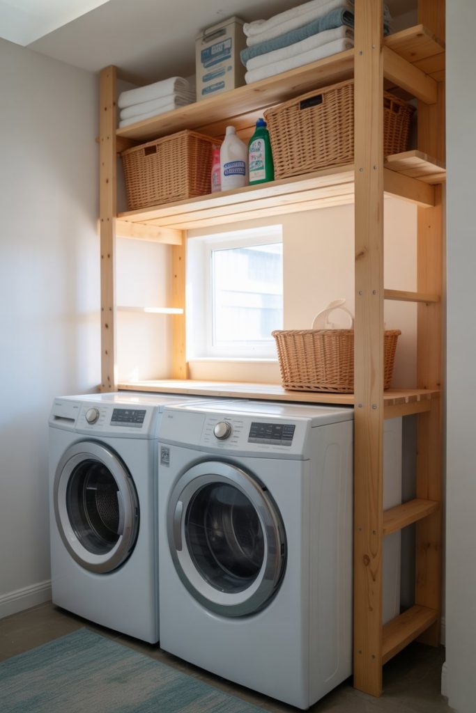 Build a DIY loft shelf above your appliances to hold seasonal bins or laundry baskets. This stacked upper storage design keeps clutter off the floor and visually enlarges the room. It’s perfect for renters and small homeowners who crave extra capacity without sacrificing style or functionality.