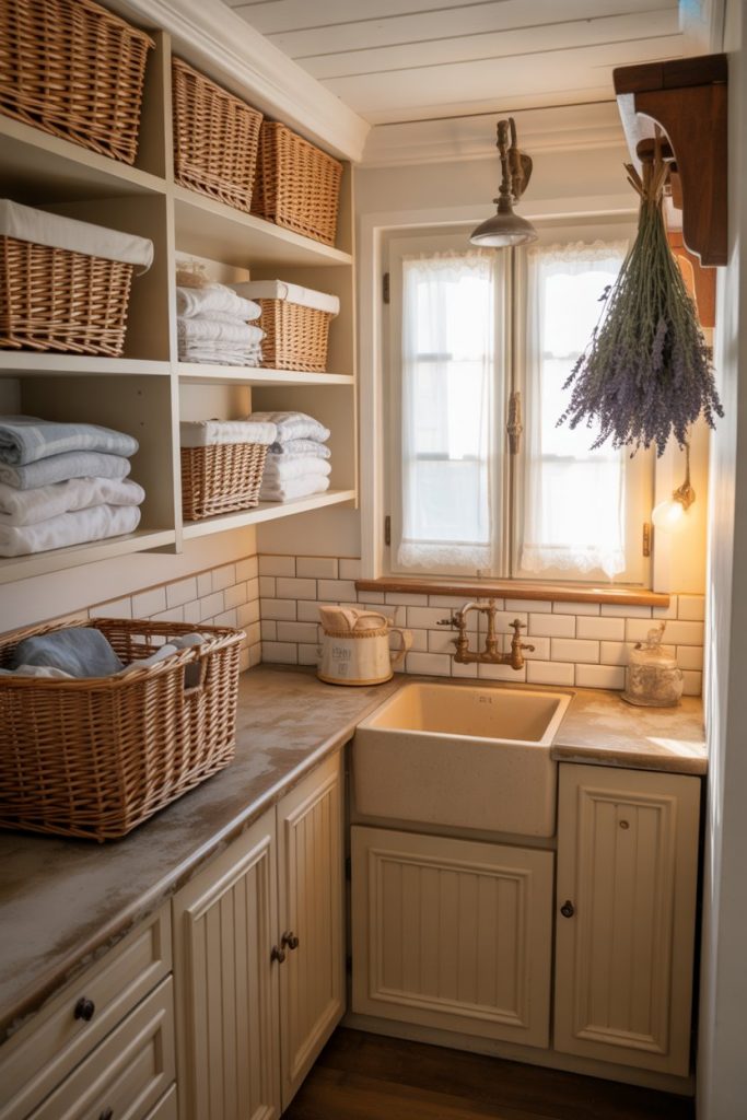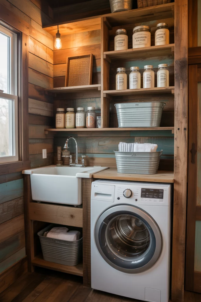 For those who love charm, a rustic farmhouse-inspired laundry nook delivers both style and comfort. Use reclaimed wood shelves, distressed paint finishes, and a small sink with a vintage faucet. Add wallpaper in a floral or gingham pattern to complete the cozy vibe. This design suits country homes or apartments wanting countryside warmth.