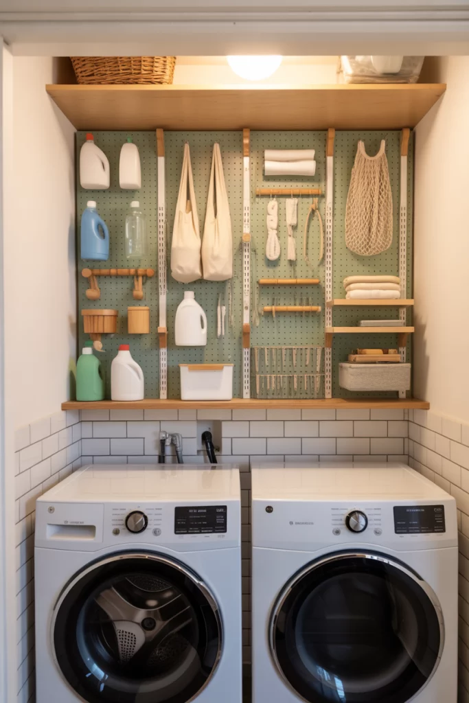Create a DIY pegboard wall above your machines to hang baskets, brushes, and detergent bottles. This stacked vertical storage method lets you customize your layout and keep essentials within reach. Pair it with a space saving folding stool to maintain easy access. Ideal for renters who need portable organization.