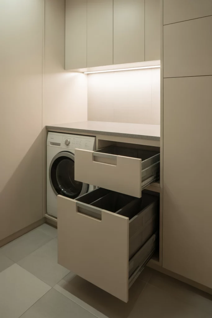 Innovative designers now create pull-out laundry drawers under counters or next to bathrooms. These drawers hide mini top load units or stackable mini washers, offering privacy and order. It’s a smart way to bring functionality to apartments without taking up visual space.