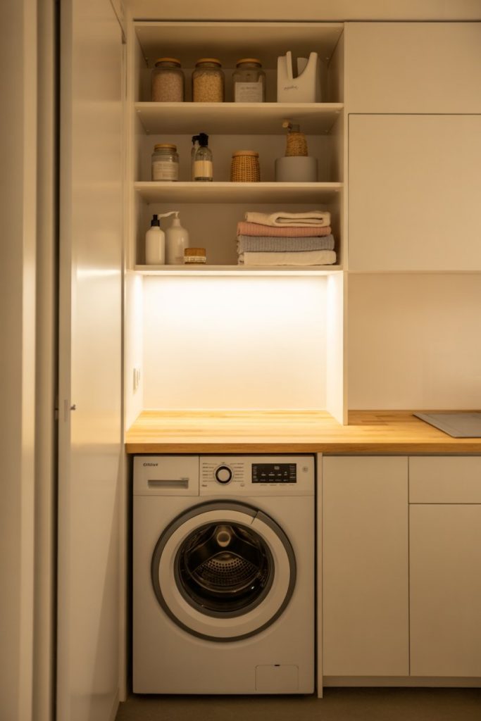Install a compact top loader or front-load washer beneath a counter to double your workspace. Add stackable storage above or beside it for detergents and towels. This approach makes the laundry area feel like part of the kitchen or vanity zone while remaining completely practical for space saving living.