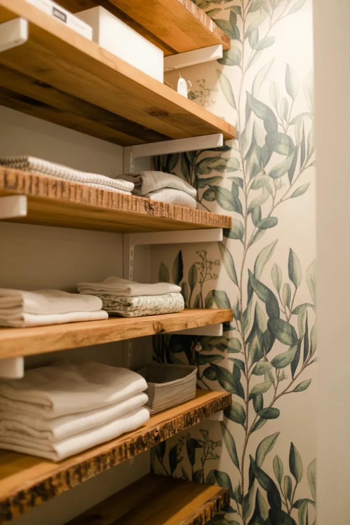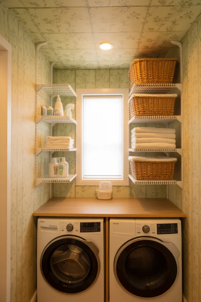 Blend rustic charm with creativity by pairing wooden shelves and patterned wallpaper behind your laundry units. The mix of textures turns an ordinary corner into a cozy spot while allowing stackable storage for baskets or jars. It’s a warm, decorative approach that works wonders in modern apartments and small cottages alike.