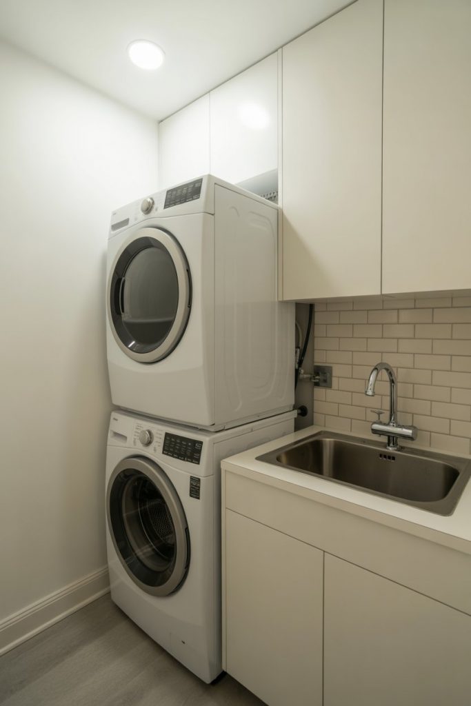 A clever twist for compact spaces is combining a stackable with sink layout. Place the washer below, dryer above, and integrate a small sink beside them. This setup provides efficiency and extra storage while maintaining a sleek look. Designers at Elle Decor recommend this option for urban condos where plumbing access is limited but functionality matters most.