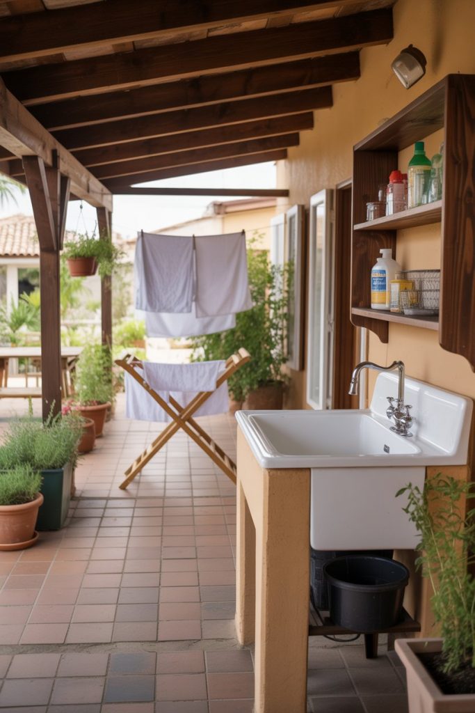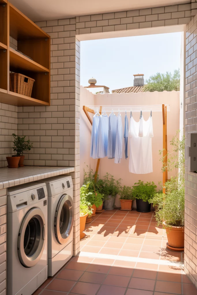 In warm climates, transform a sheltered outdoor area into your laundry zone. Add weather-resistant clothes drying racks, a sink, and a stackable washer and dryer under a roofed patio. Use bamboo screens or curtains for privacy. This fresh-air design keeps moisture outdoors and gives you extra indoor room.
