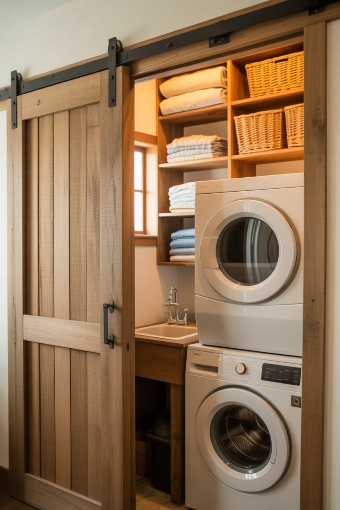 Give your laundry space personality with a sliding barn door. It adds rustic flair while hiding the stackable washer and dryer when not in use. Install slim storage racks behind the door to keep supplies accessible yet hidden. It’s a blend of farmhouse charm and modern space saving functionality.