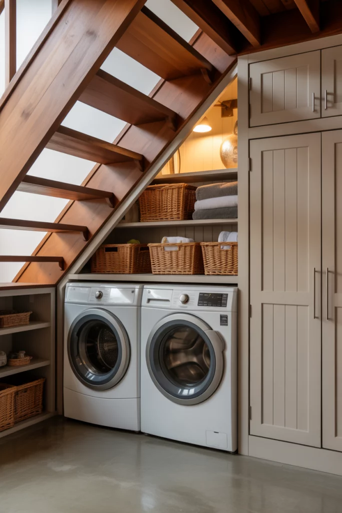 Maximize unused space by placing a laundry zone under your stairs. A stacked washer and dryer fit perfectly beneath the incline, leaving room for drawers or built-in storage below. Home designers worldwide showcase this clever space saving hack for narrow townhouses and small family homes where every inch counts.