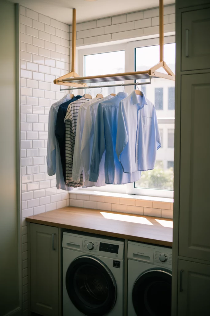 When floor space is limited, install clothes drying racks that retract from the wall or hang from the ceiling. Position them near a window to help airflow and natural light speed up drying. You can even build a stackable diy hanging rail above your machines for added convenience. Eco-conscious households love this sustainable approach to air-drying.