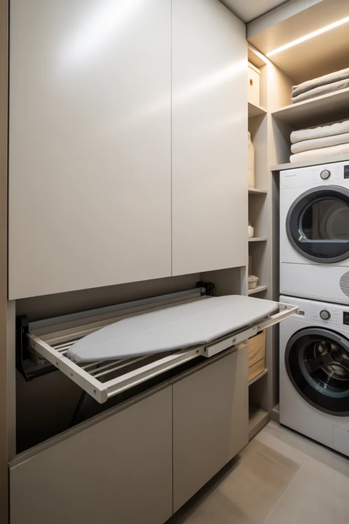 A built-in ironing board that slides or folds out from the wall makes ironing effortless and tidy. Pair it with compact Ikea cabinets for a clean, modern look that complements your appliances. This hidden board saves valuable storage space and blends seamlessly into any small laundry design.