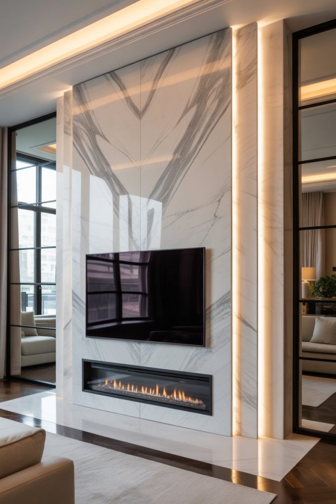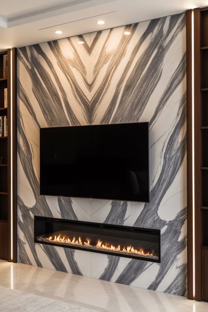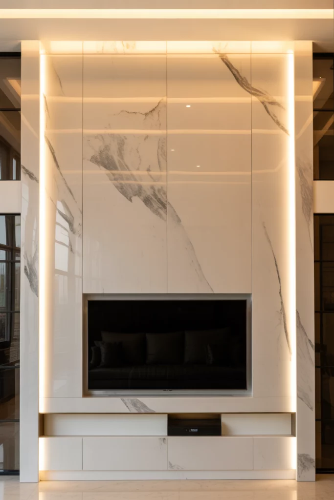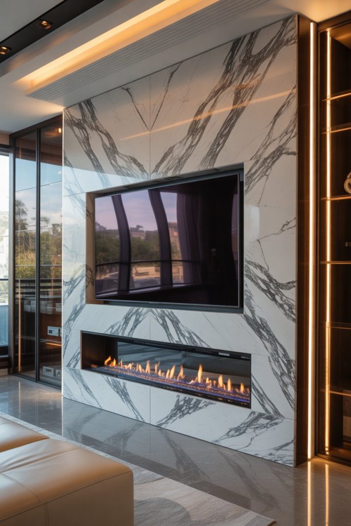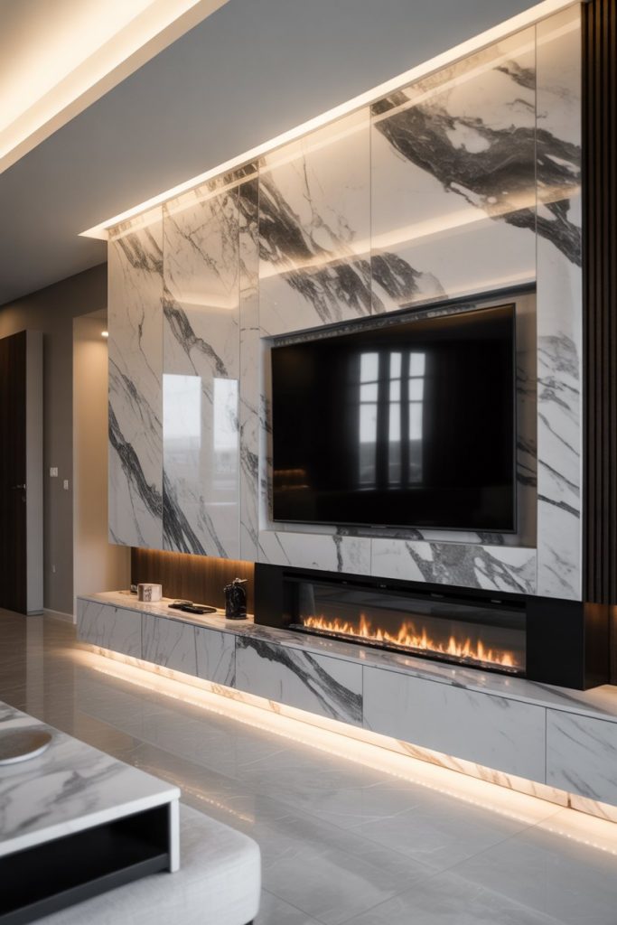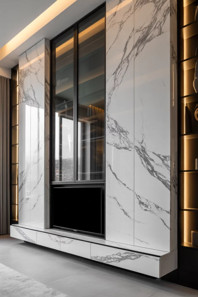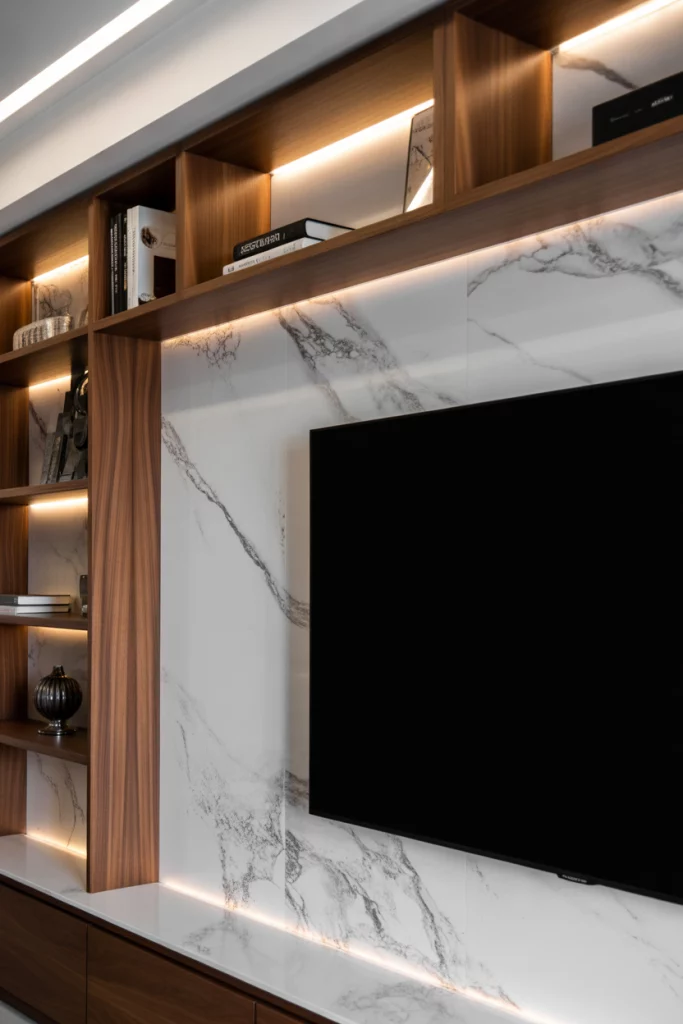 A luxury marble TV wall combined with built-in open shelving merges glamour and practicality. The contrast of glossy marble with wood shelving and storage cubbies offers a refined modern look. Integrate discreet LED strips for depth and display art or books beside the screen. It’s both decorative and functional—perfect for a living room centerpiece.
