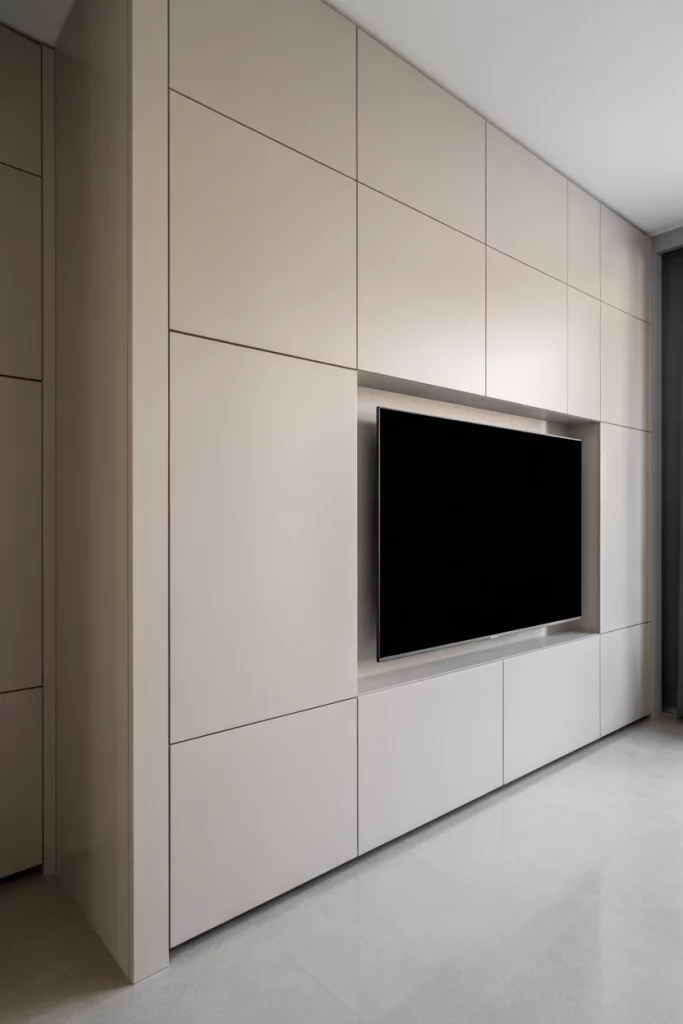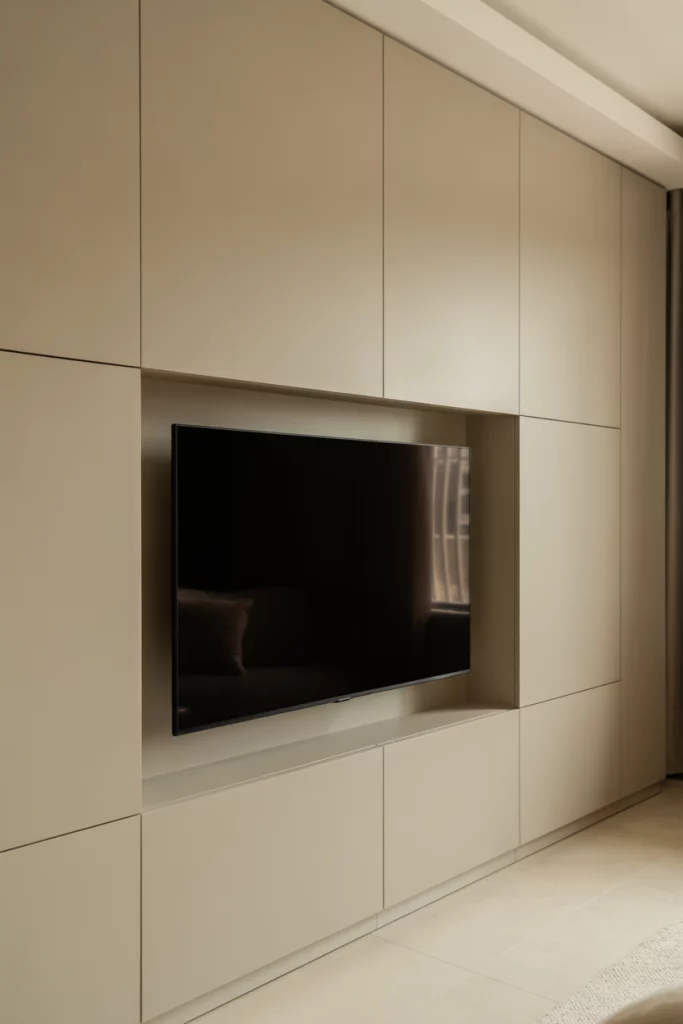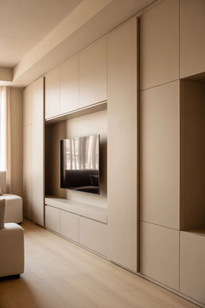 In a small space, a TV wall with sliding panels creates flexibility and storage convenience. When closed, the simple panels hide the screen, maintaining a calm minimalist look. When open, they reveal a full entertainment setup. Soft neutral tones and gypsum finishes keep it elegant yet discreet—ideal for multipurpose living rooms.