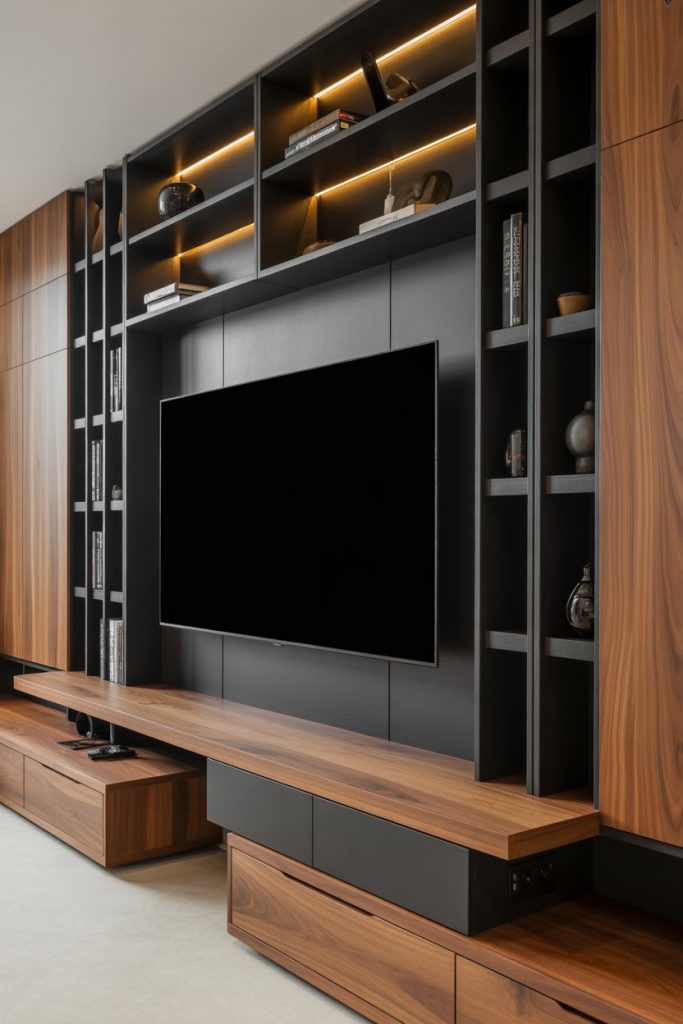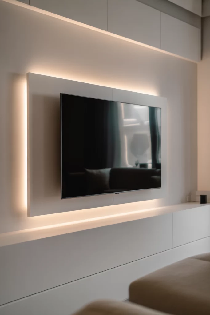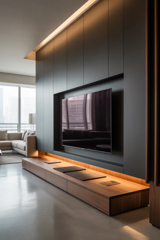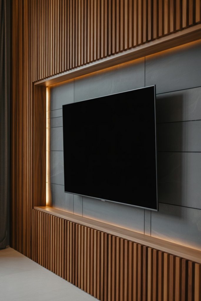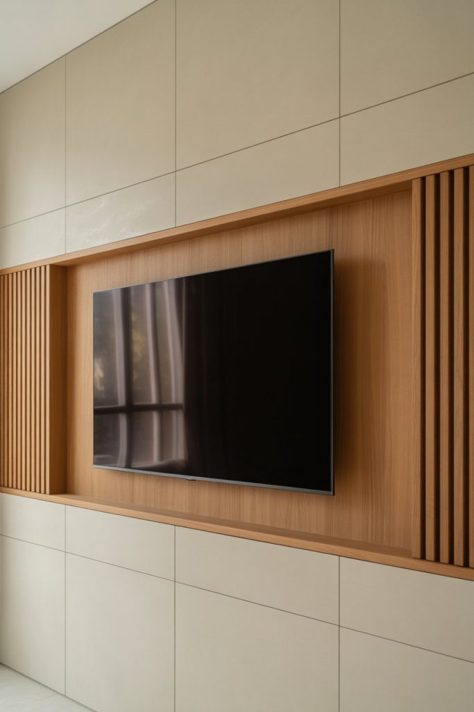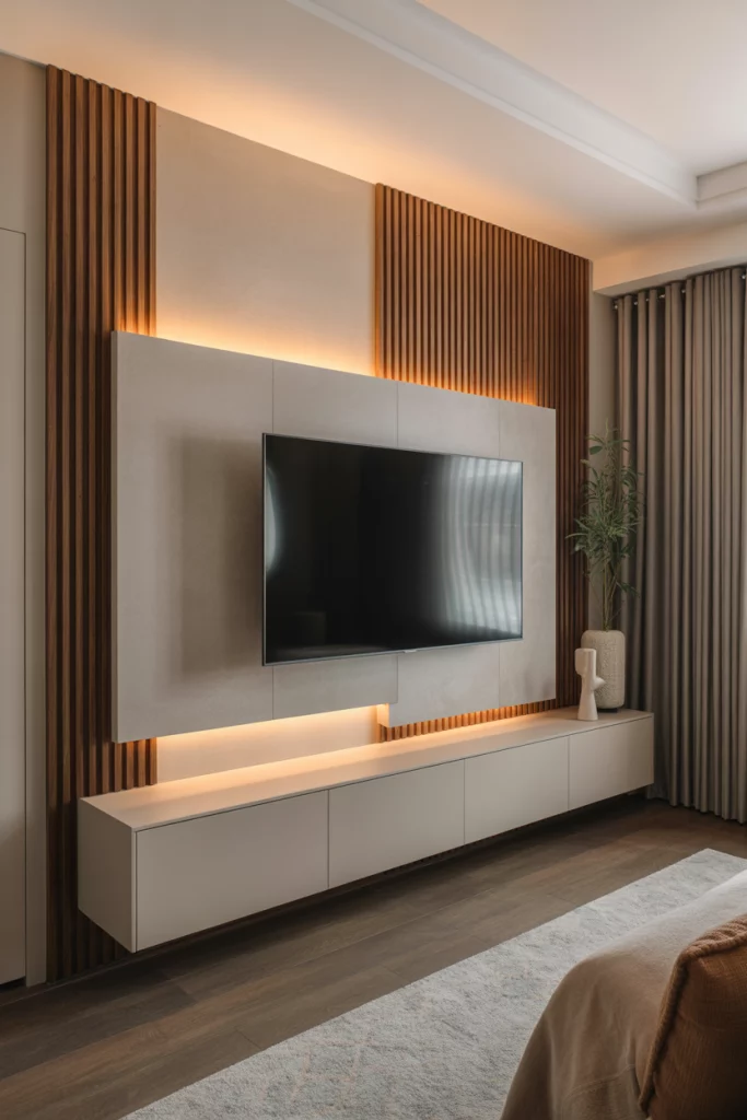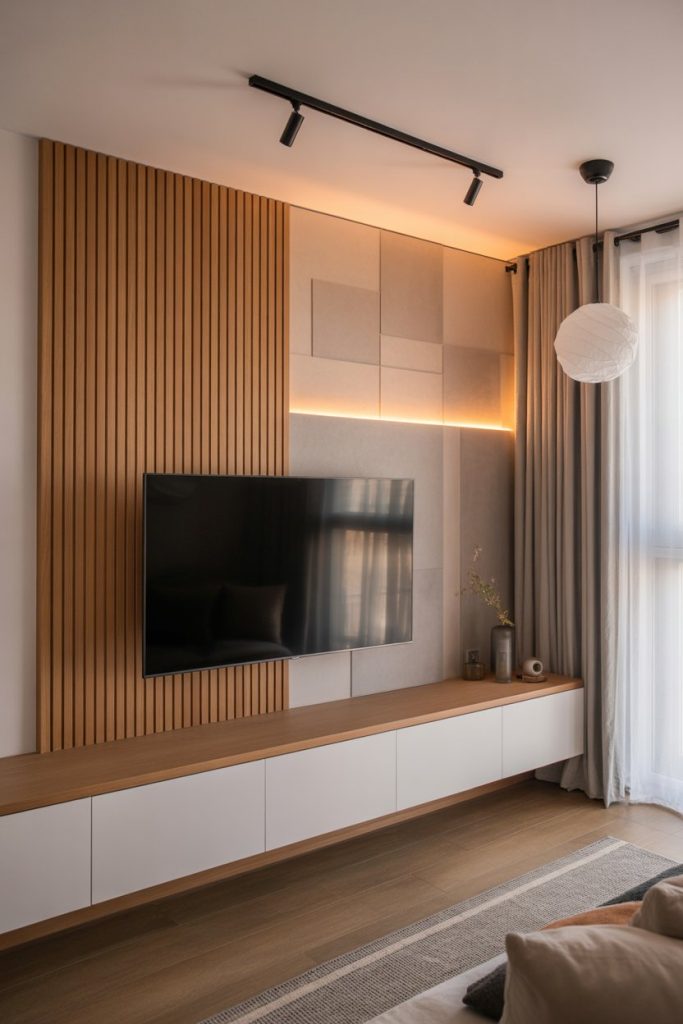 Blending gypsum panels with warm wood brings contrast and coziness. This hybrid wall suits a modern luxury apartment, offering natural charm with contemporary precision. Use vertical wood slats to accent the TV zone and create storage niches. The tactile mix of materials softens technology’s presence and grounds it in craftsmanship. This design feels both simple and sophisticated—perfect for a cozy living room.