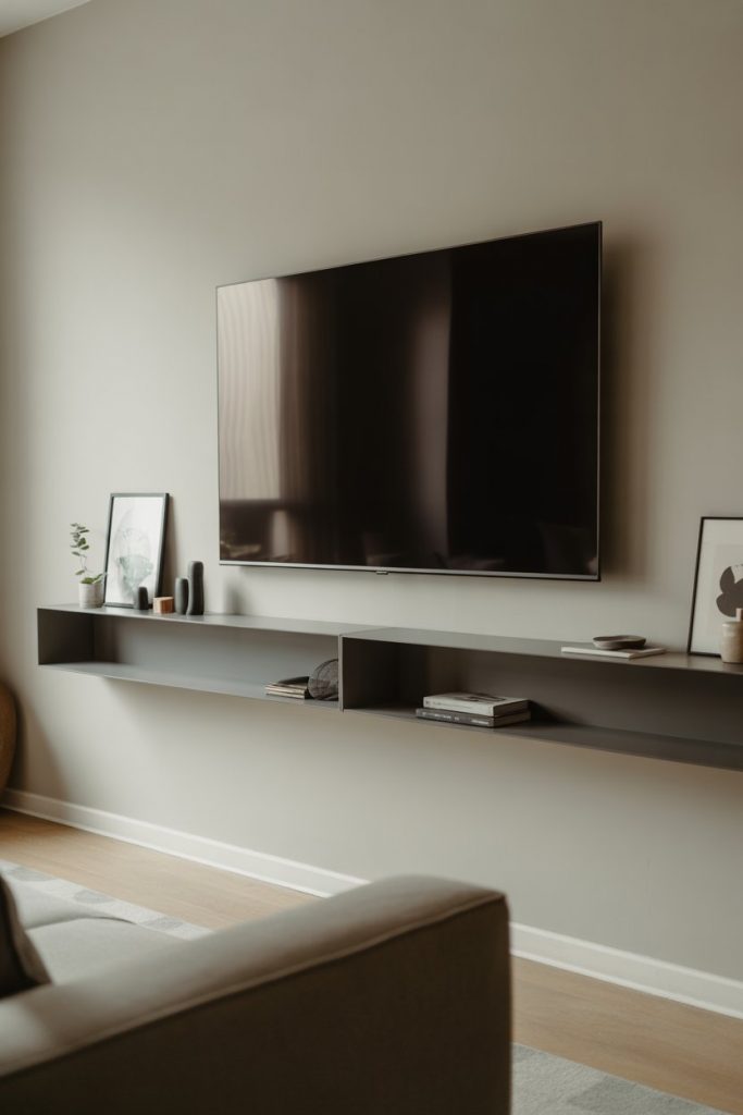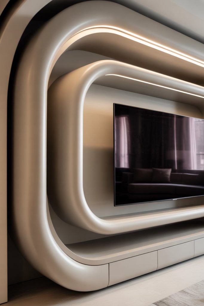 Curved shapes are trending in 2026, making a minimalist curved TV wall a soft yet modern feature. Instead of sharp corners, the wall flows gently around the screen, creating an elegant sculptural form. This look fits futuristic interiors and can even include storage niches following the curve. The shape adds comfort and movement, inspired by organic design seen in Milan Design Week showcases.