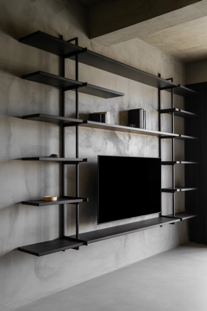 For an edgier vibe, a modern TV wall in raw concrete or microcement offers a rugged minimal look. Paired with black metal shelving or reclaimed wood, this design suits loft-style living rooms. Add hidden storage to balance beauty with function. Influenced by industrial chic aesthetics, this is perfect for those who love a simple, urban lifestyle.
