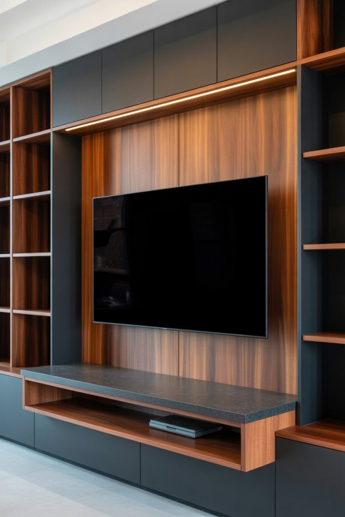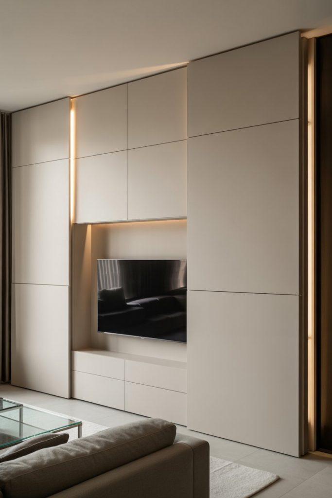 For those who prefer clean living, a simple, minimal, modern TV wall with built-in storage defines efficiency. Use flat panels, push-to-open drawers, and concealed wiring. Light wood, gypsum, or white laminate keeps the look calm and organized. Perfect for both living room and office use, this style emphasizes clarity and purpose—a core value of contemporary interior design.