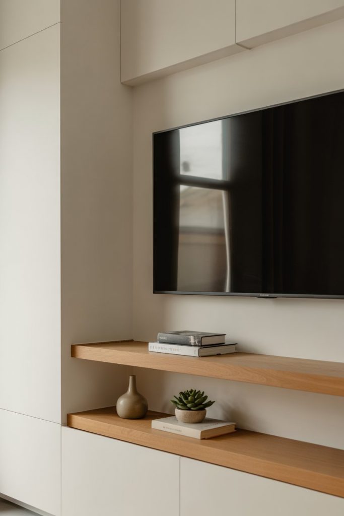 A refined Japandi concept adds a recessed niche behind the TV framed in luxury wood or stone. Keep the composition minimal, using a modern balance of texture and light. Hidden drawers beneath complete the serene picture. The combination of simplicity and craftsmanship offers timeless charm and warmth in both bedroom and living room settings.