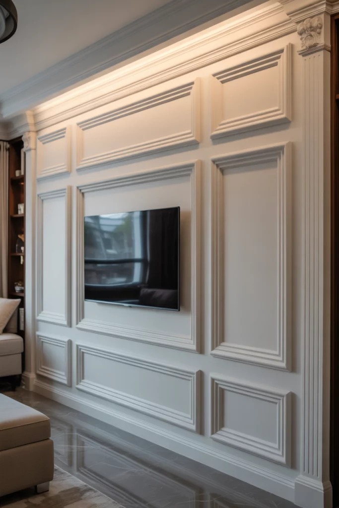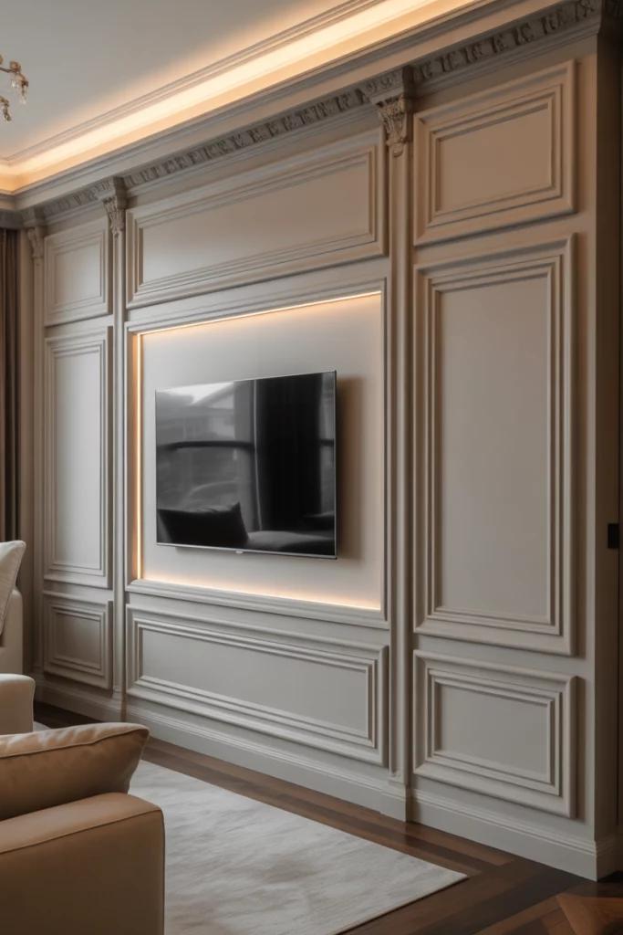 A neoclassical TV wall with detailed gypsum moldings blends classic architecture and modern comfort. Frame your television with decorative panels, fluted columns, or symmetrical pilasters. Combine neutral hues with subtle gold or cream for an elegant effect. Integrated storage can stay hidden behind paneled doors. This style, seen in Architectural Digest features, suits a living room where grandeur meets refinement.
