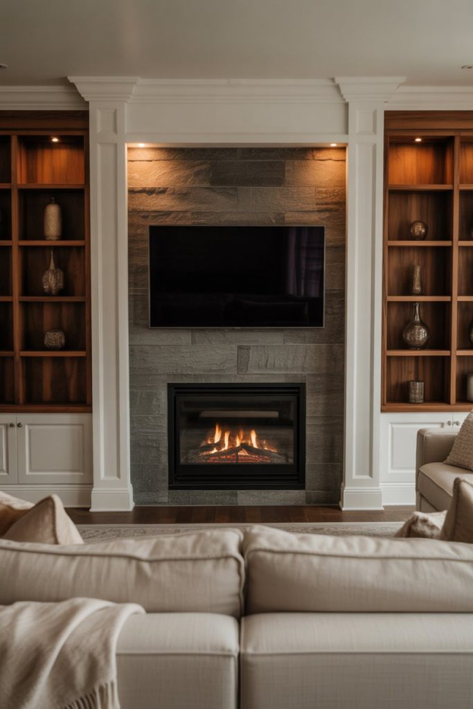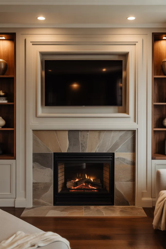 A classic media wall with a fireplace exudes timeless luxury. Use symmetrical stone cladding or gypsum borders to frame both the TV and hearth. Add subtle LED accents and storage on the sides to preserve an elegant look. This design balances warmth and sophistication—a favorite among traditional decorators and seen frequently in House & Garden features.