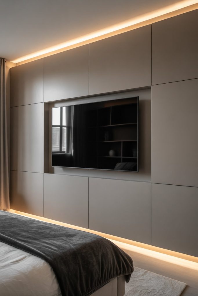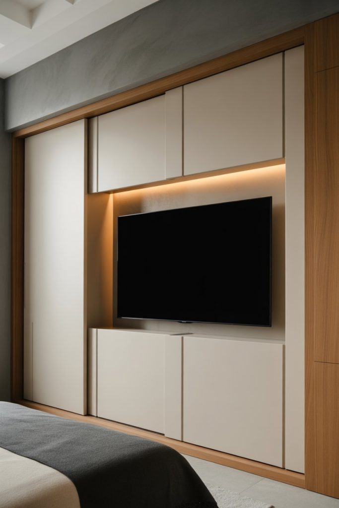 For smaller homes, a bedroom TV wall design incorporates hidden storage behind sliding gypsum panels. The design maintains a minimalist and uncomplicated approach, ideal for a peaceful sanctuary. Opt for a soft palette and gentle lighting for a modern and comfortable vibe. Inspired by designers like Amber Lewis, this style beautifully showcases the approach of thoughtful restraint.
