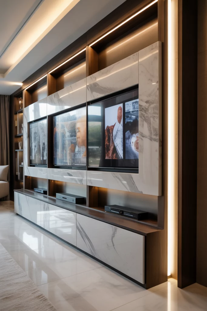 A futuristic luxury TV wall merges technology and luxury classic finishes. Multiple screens can be embedded in luxury marble or metal panels to display art or entertainment. Concealed storage houses devices, keeping everything minimal. This high-end modern feature appeals to design enthusiasts who treat media as décor. Publications like Wired predict more homes will turn screens into art walls by 2026.