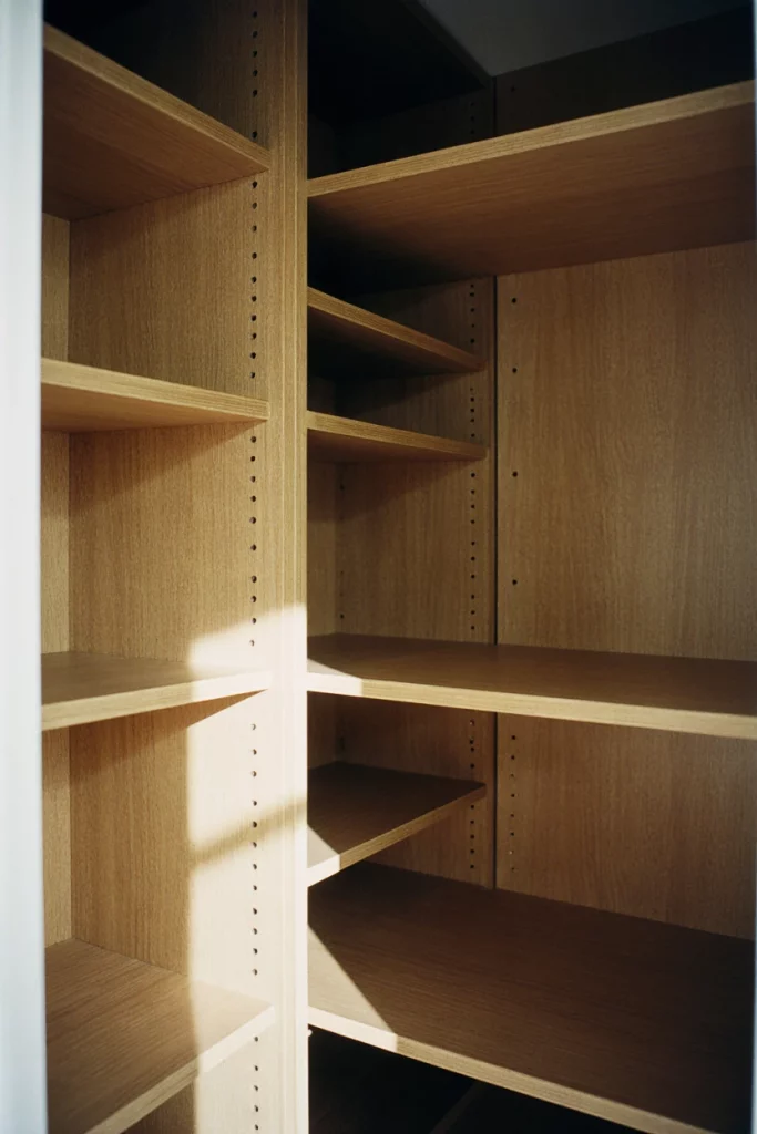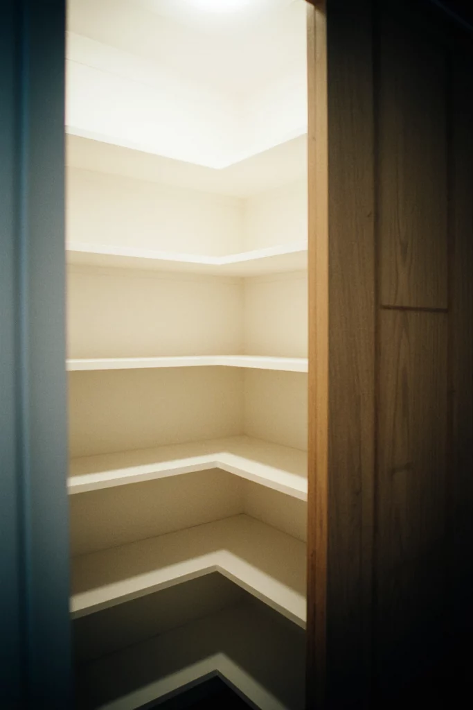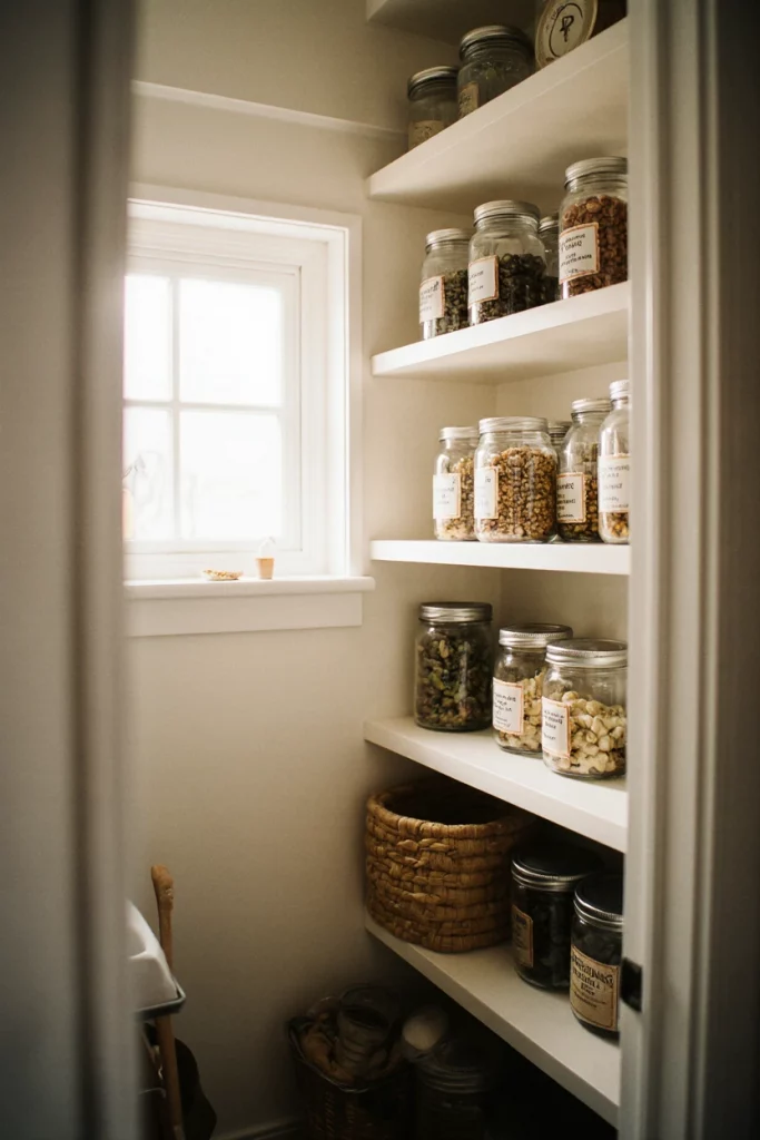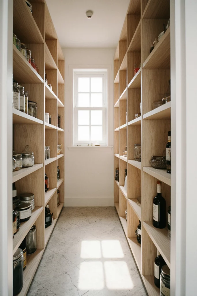 This airy pantry emphasizes clean surfaces, soft textures, and streamlined shelving, ideal for homes with a layout with a window or flexible layout storage. Gentle light enhances visibility, while the minimalist palette creates calm in a busy kitchen. The look supports clear organization patterns and works beautifully for households that prioritize low-maintenance design and a clutter-free feel.