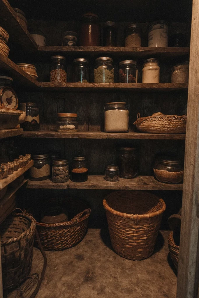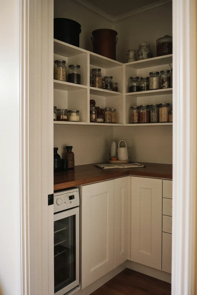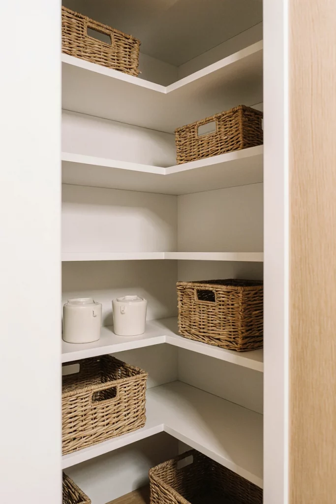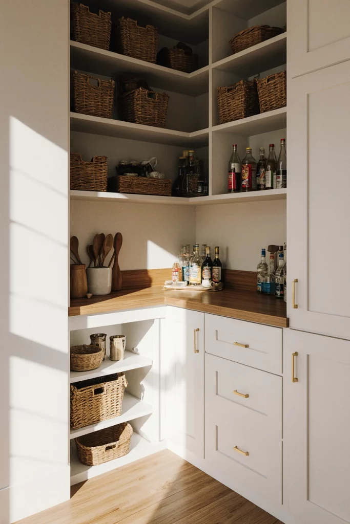Natural wood and textured finishes give this pantry a warm, rustic atmosphere that pairs beautifully with corner arrangements and flexible layout storage. Weathered materials add character while still supporting strong organization. It brings a grounded, cozy feeling perfect for farmhouse-inspired homes.