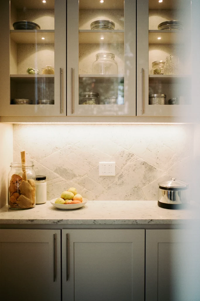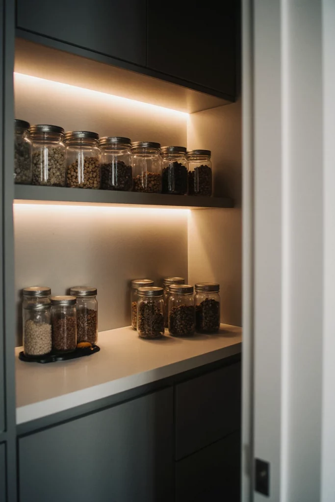 This sleek modern pantry uses glass fronts to display curated items while enhancing layout storage. Soft lighting highlights jars and creates a boutique-like mood. The combination of transparent elements and muted colors gives the pantry a refined character that pairs well with high-end kitchens.