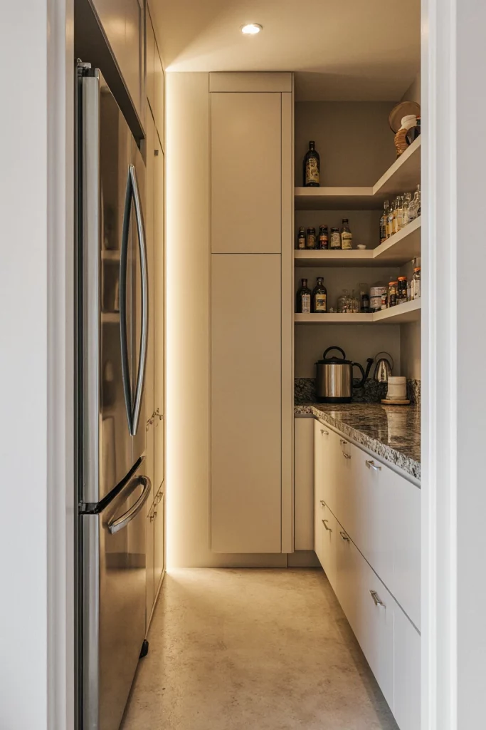 This pantry merges tall storage with a lower fridge drawer, ideal for tight layout size arrangements. The blend of heights creates balance while improving access to snacks and refrigerated items. Clean lines and warm materials help the pantry feel polished and modern, even in compact homes.